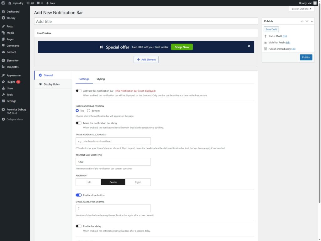 Review your notification bar in the live preview to ensure the title looks exactly as you want it. Make any final adjustments to the settings, then click Publish or Update to save your changes.