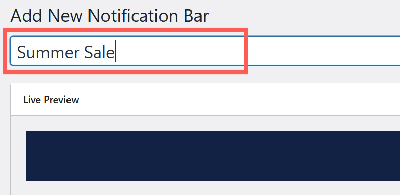 At the top of the editor, enter a title for your notification bar. Use a descriptive name like “Summer Sale Banner” or “Email Signup Promo” so you can easily find it later.
