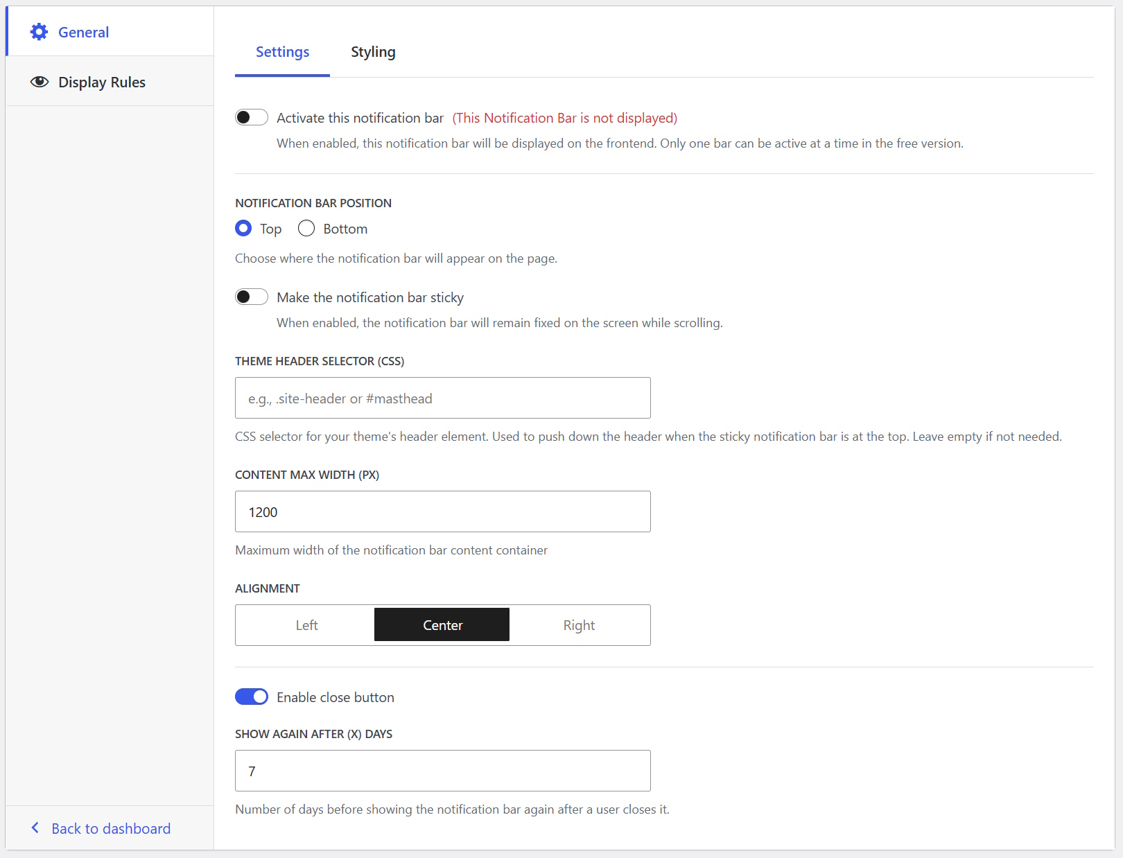 Here you can change various settings like the position, sticky mode, enable or disable the close button. etc. You can also style your notification bar here (options for individual elements are available by clicking each element from the preview area).